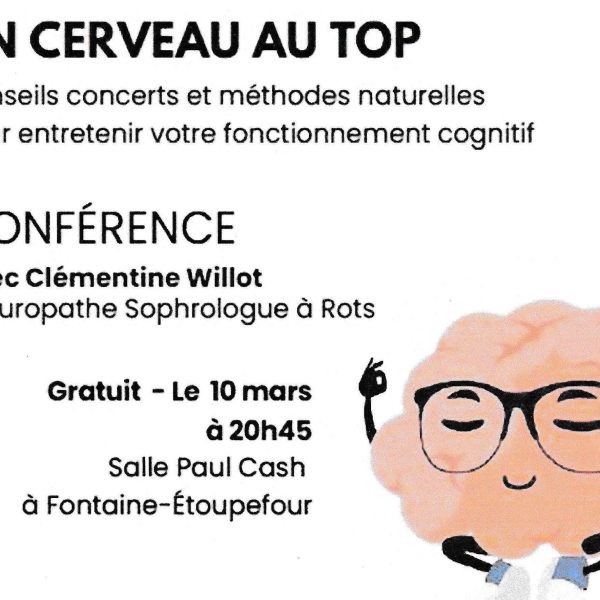 Une conférence « un cerveau au top » animée par Clémentine Willot, naturopathe, sophrologue et organisée par l’asso Gym Fontaine Verson.