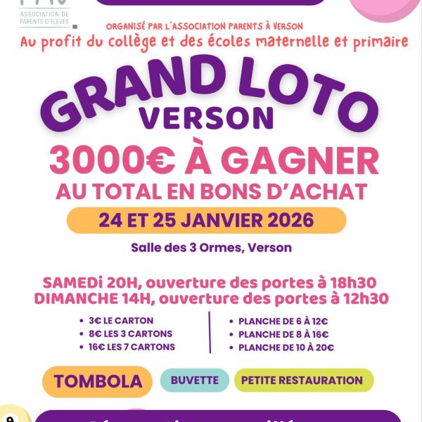 GRAND WEEK-END LOTO animé par ISANIMATION organisé par l’association Parents à Verson au profit des enfants des écoles et du collège.