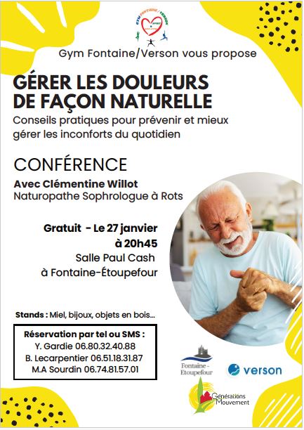 Conférence : gérer les douleurs de façon naturelle avec Clémentine Willot, naturopathe sophrologue à Rots, salle Paul Cash à Fontaine Etoupefour.